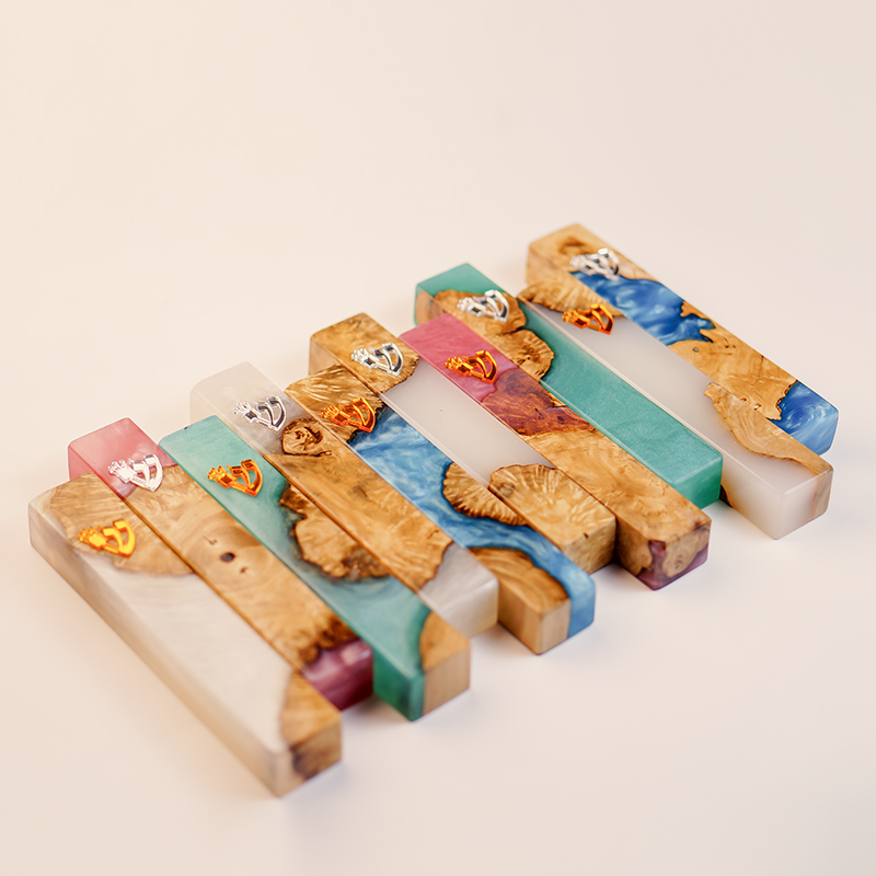 An epoxy resin mezuzah case is crafted by combining solid natural wood with epoxy resin, resulting in a unique visual effect where no two pieces are exactly the same.